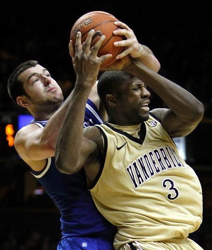 Festus Ezeli of Vanderbilt and Brandon Knight eye the basketball