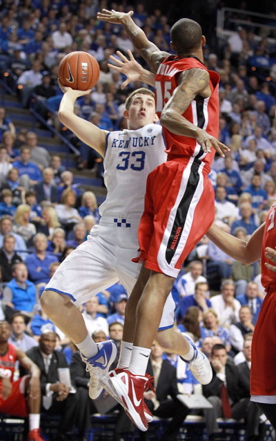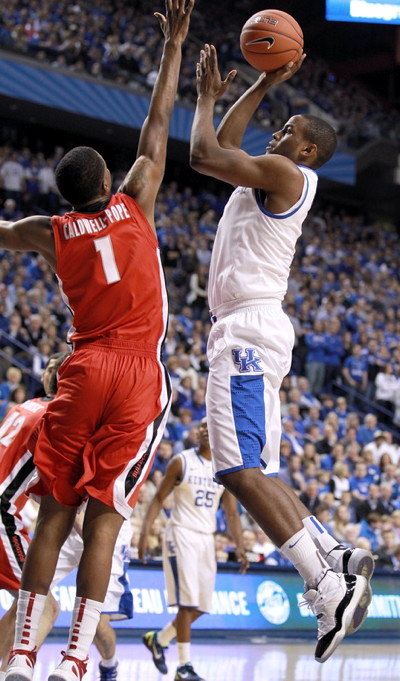 Senior Darius Miller shoots over Georgia freshman Kentavious Caldwell-Pope (#1)