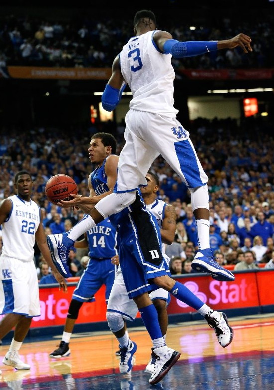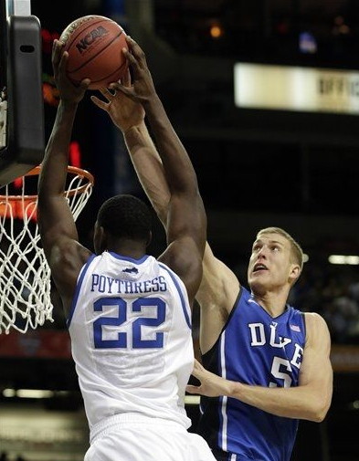 Alex Poythress (#22) attacks as the basket guarded by Duke's Mason Plumlee (#5)
