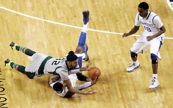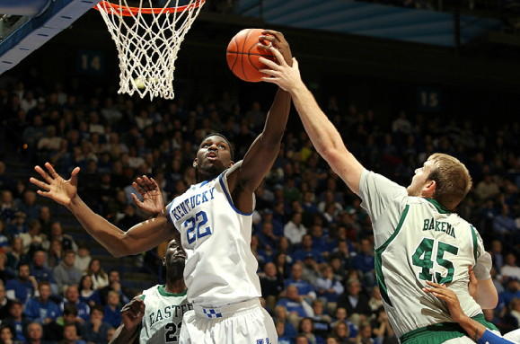 Willie Cauley-Stein tries to get the ball to Ryan Harrow (#12) as EMU's Jamell Harris (#32) lunges on top