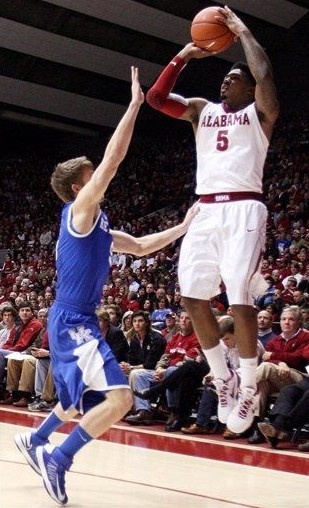 Alabama's Trevor Lacey (#5) shoots over Jarrod Polson