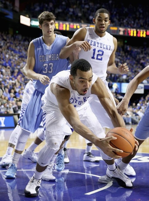 Trey Lyles grabs a rebound while Karl-Anthony Towns (#12) and Columbia's Luke Petrasek (#33) look on