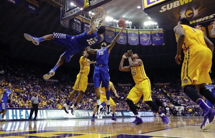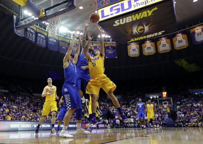 LSU's Josh Gray (#5) attempts a shot while defended by Kentucky's Devin Booker (#1) and Willie Cauley-Stein