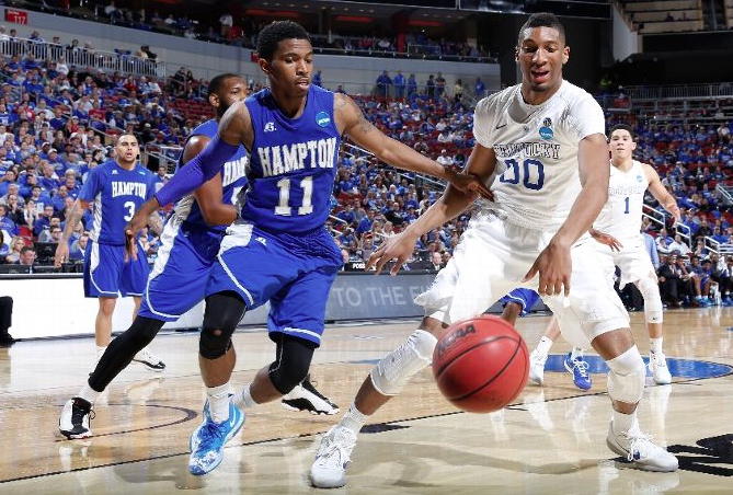 Dakari Johnson (#44) defends against the shot of Hampton's Quinton Chievous (#3)