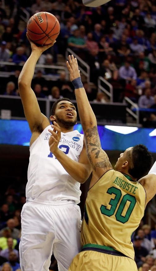 Karl-Anthony Towns (#12) shoots a hook over Zach Auguste (#30)
