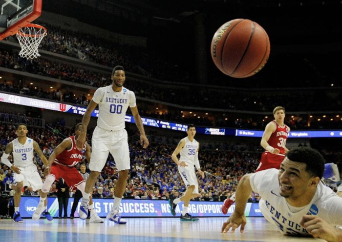 Tyler Ulis and Indiana's Yogi Ferrell (#11) reach for loose ball
