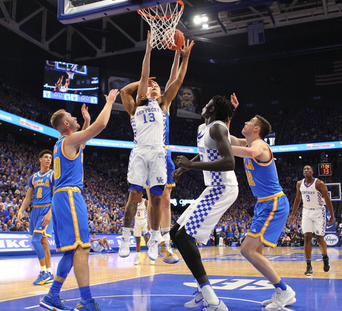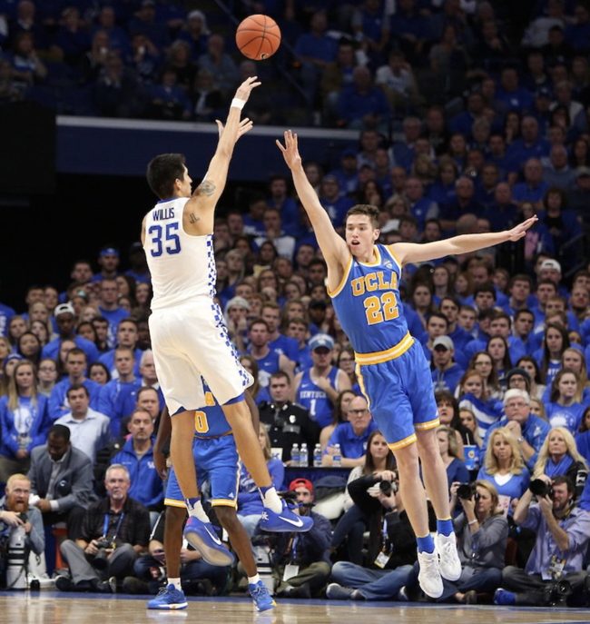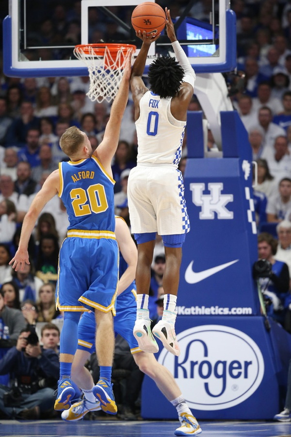 De'Aaron Fox (#0) shoots while defended by UCLA's Bryce Alford (#20)