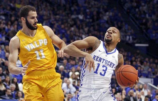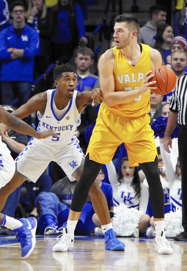 Malik Monk (#5) defends against Valparaiso's Alec Peters