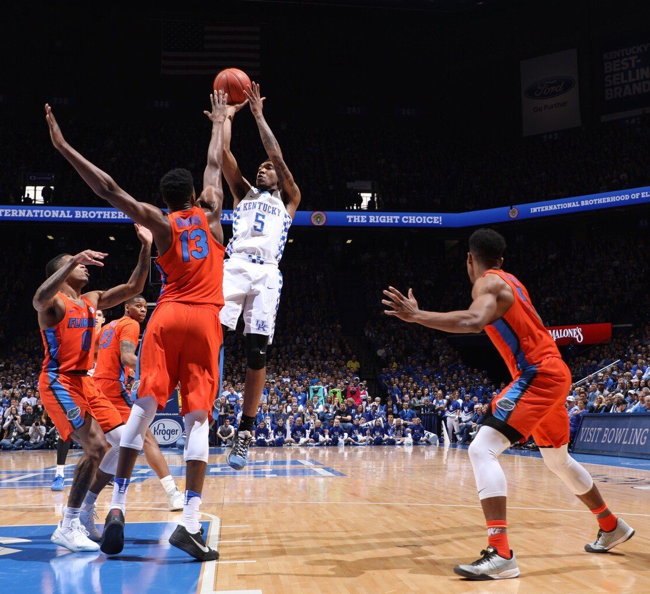 Malik Monk (#5) shoots over Florida's Kevarrius Hayes (#13)