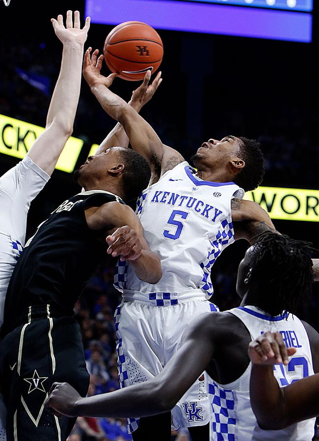 Vanderbilt's (and Lexington born) Luke Kornet holds onto loose ball while Bam Adebayo and De'Aaron Fox lay sprawled on floor