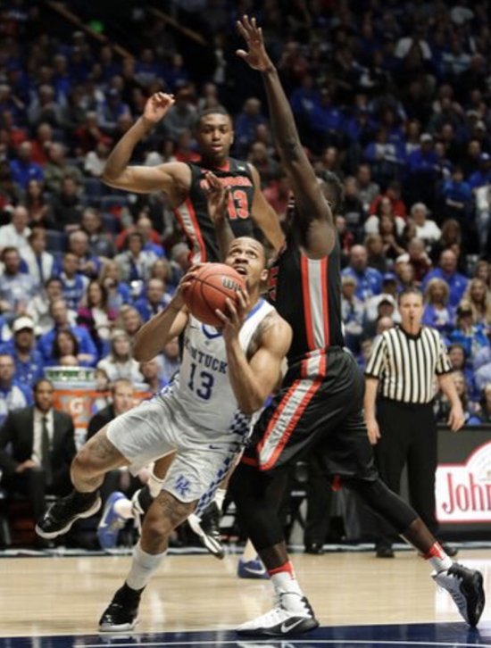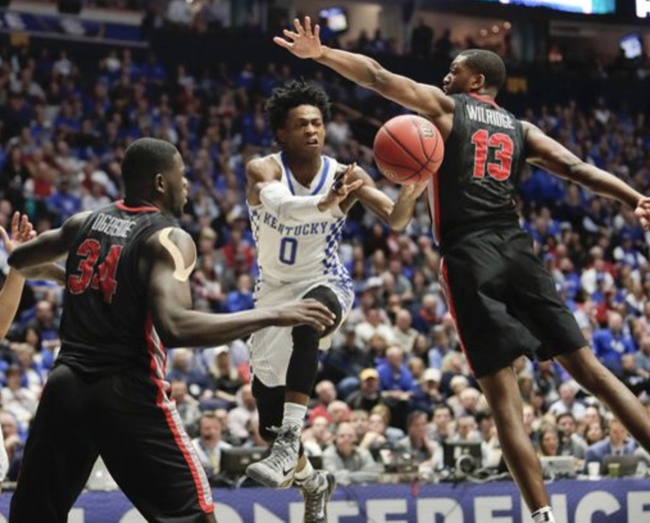 De'Aaron Fox (#0) passes between Georgia's Derek Ogbeide (#34) and E'Torrion Wilridge (#13)