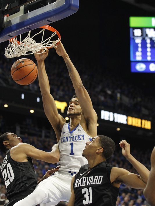 Kevin Knox shoots over Harvard's Chris Lewis and Seth Towns (#31)