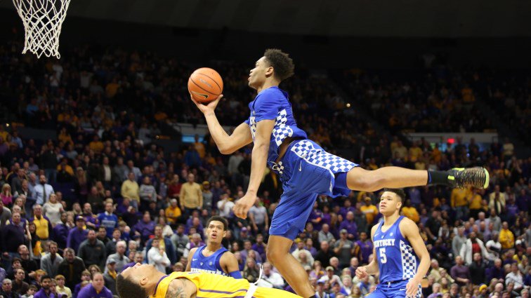 Shai Gilgeous Alexander (#22) zips a pass by LSU's Tremont Waters