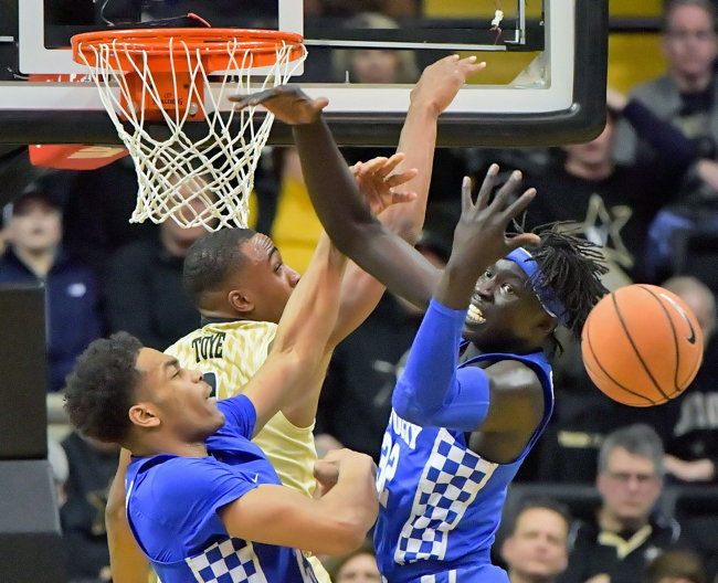 Wenyen Gabriel and P.J. Washington fight Vandy's Joe Toye for a rebound