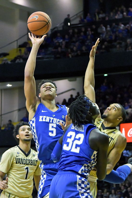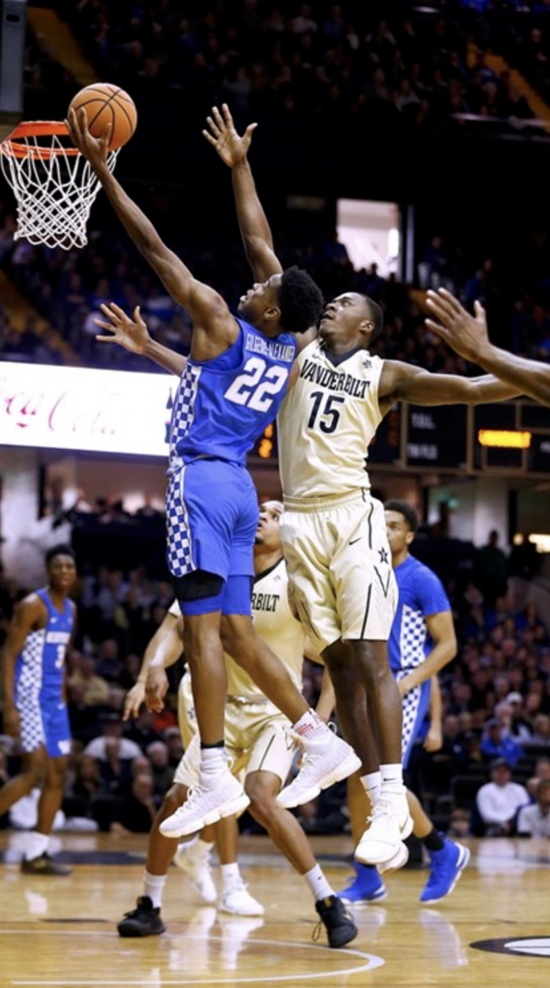 Shai Gilgeous-Alexander (#22) lays the ball in ahead of Vanderbilt's Clevon Brown (#15)