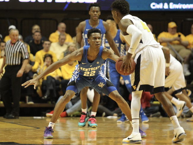 Shai Gilgeous-Alexander (#22) defends against WVU's Daxter Miles Jr. (#4)