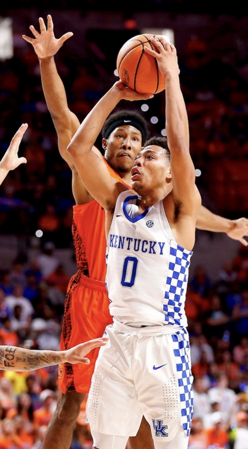 Kevin Knox shoots a floater over Florida's KeVaughn Allen (#5)