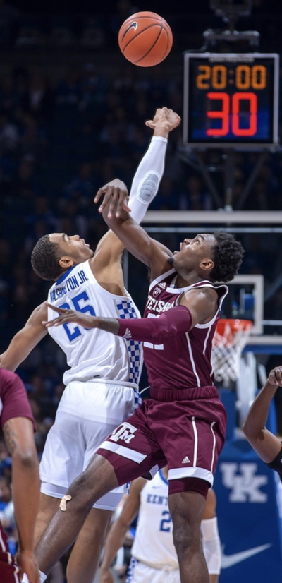 Ashton Hagans (#2) tries to fight off Texas A&M's Wendell Mitchell (#11)
