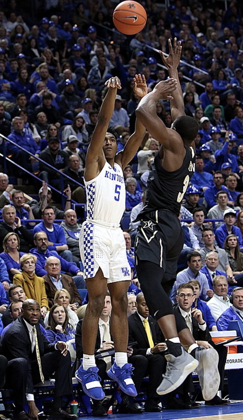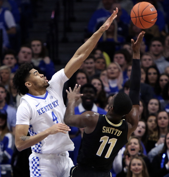 Keldon Johnson (#3) dishes off to Reid Travis (#22) while defended by Vanderbilt's Clevon Brown (#15)