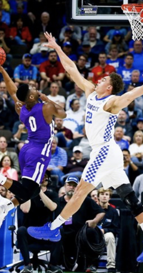 Reid Travis (#22) stretches to defend against Abilene Christian's Jaylen Franklin (#0)