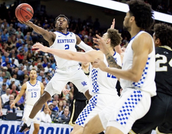 Ashton Hagans (#2) stretches for a layup as Reid Travis and Nick Richards clear a path
