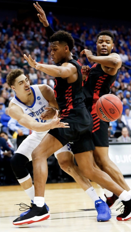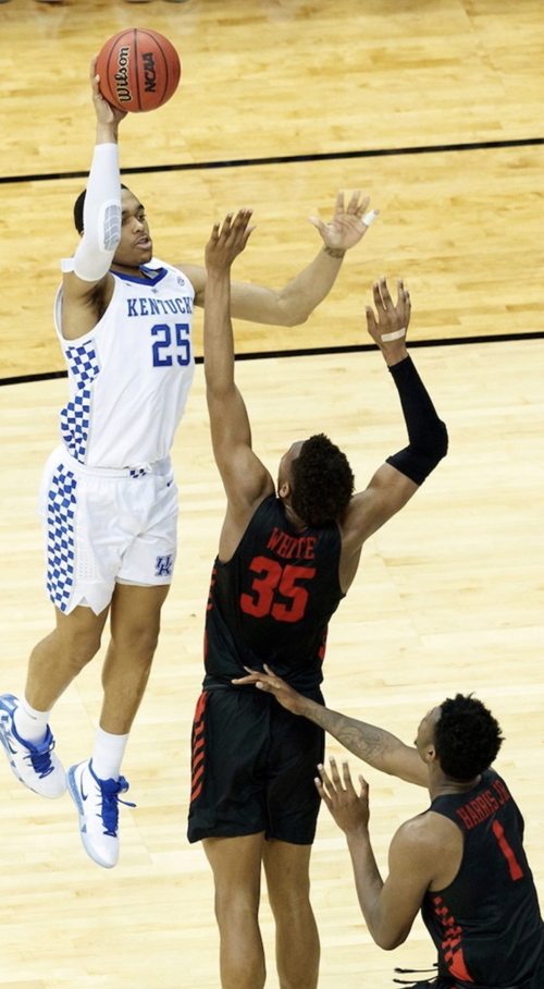 Keldon Johnson (#3) looks on as Tyler Herro hits a late-game 3 to put UK back in the lead