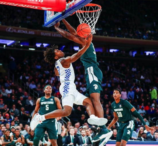 Ashton Hagans (#0) tries to steal the ball away from MSU's Cassius Winston (#5)