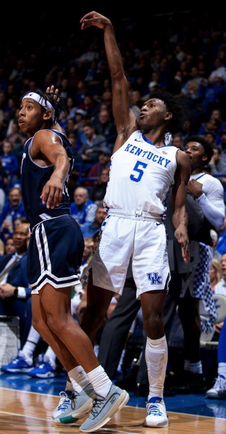 Immanuel Quickley (#5) watches one of his three-point shots along with Mount St. Mary's Damian Chong Qui