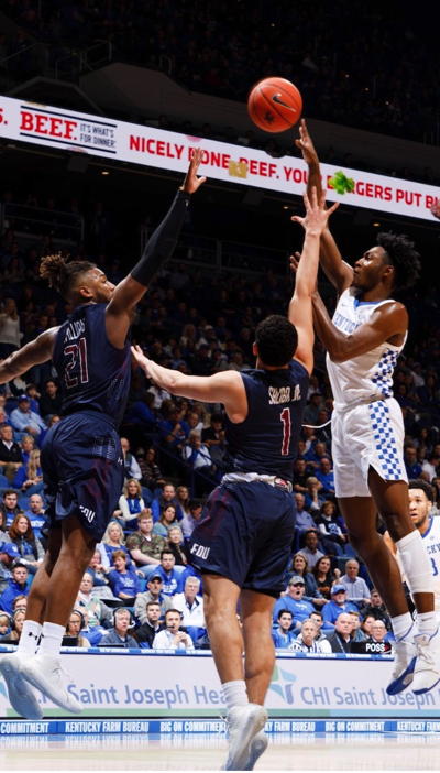 As does Immanuel Quickley, here shooting over FDU's Elyjah Williams (#21) and Bassel Saliba Jr. (#1)