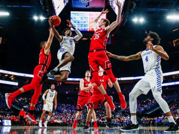 Ashton Hagans (#0) drives against Utah's Timmy Allen (#1) and Branden Carlson (#35) while Nick Richards (#4) looks on