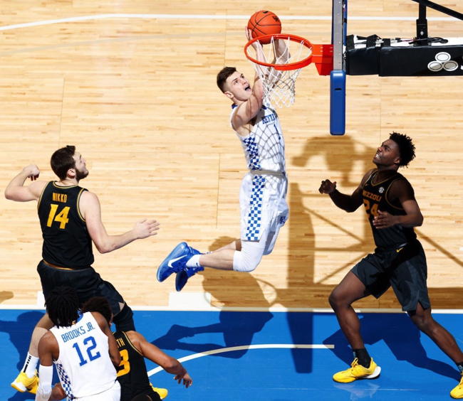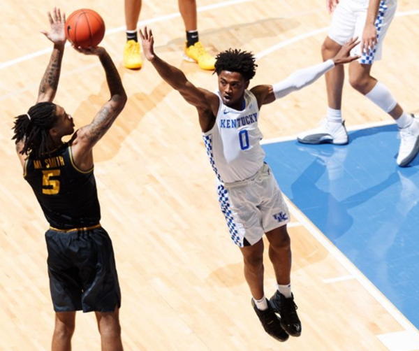 Ashton Hagans (#0) closes out on Missouri shooter Mitchell Smith (#5)