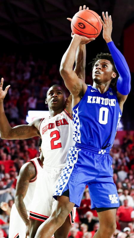 Ashton Hagans (#0) shoots ahead of Harris (#2)