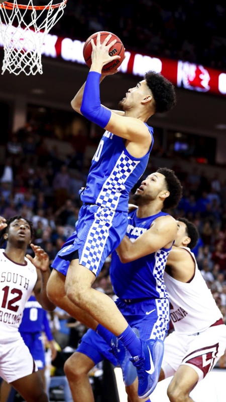 Ashton Hagans (#0) tries to score in behind South Carolina's Jermaine Cousinard (#5) and Jalyn McCreary (#4)