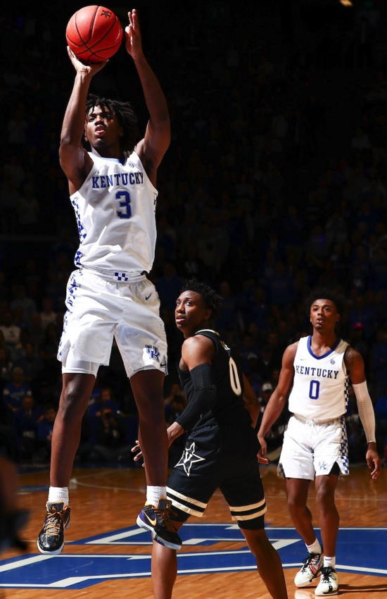 Tyrese Maxey (#3) shoots while Vanderbilt's Saben Lee (#0 black) and Ashton Hagans (#0 white) look on