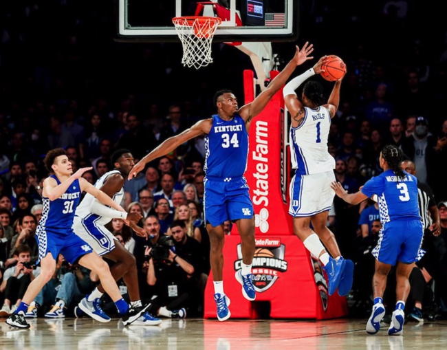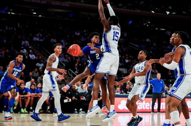 Oscar Tshiebwe (#34) defends against a drive by Duke's Trevor Keels (#1)