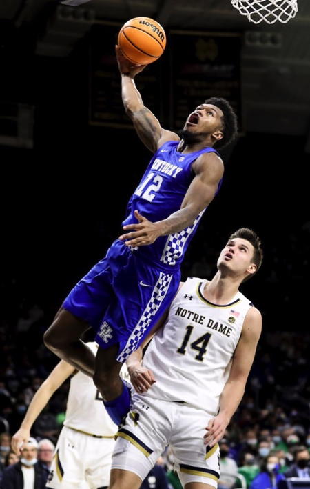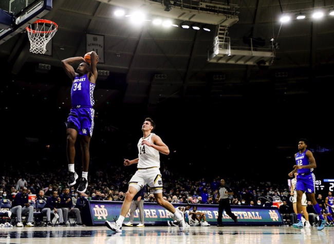 Oscar Tshiebwe (#34) gets loose for a breakaway dunk ahead of Notre Dame's Nate Laszewski (#14)
