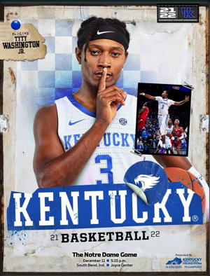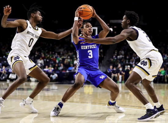 TyTy Washington (#3) is defended by Notre Dame's Blake Wesley (#0) and Trey Wertz (#2)