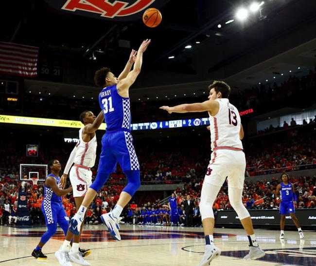 Oscar Tshiebwe (#34) tips off against Auburn center Walker Kessler (#13)