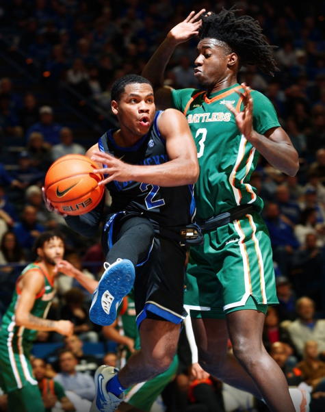 Sahvir Wheeler drives while defended by Florida A&M's Jordan Chatman (#2)