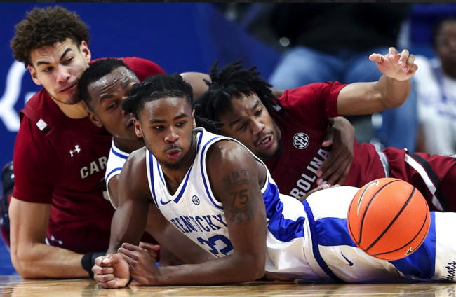 Oscar Tshiebwe, Cason Wallace and two South Carolina Gamecocks lay on the ground watching a loose ball
