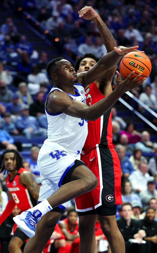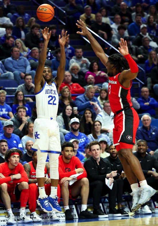 Cason Wallace (#22) shoots while defended by Georgia's Kario Oquendo (#3)