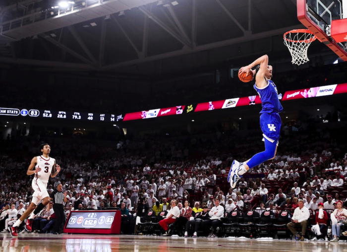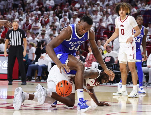 Oscar Tshiebwe (#34) gets hung up with an Arkansas player