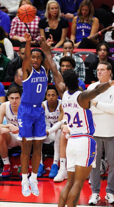 Rob Dillingham (#0) shoots a three-pointer over Kansas defender K.J. Adams