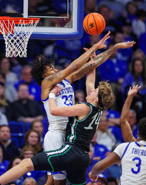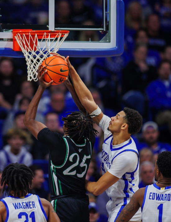 Tre' Mitchell blocks the shot of Marshall's Obinna Anochili-Killen (#25)