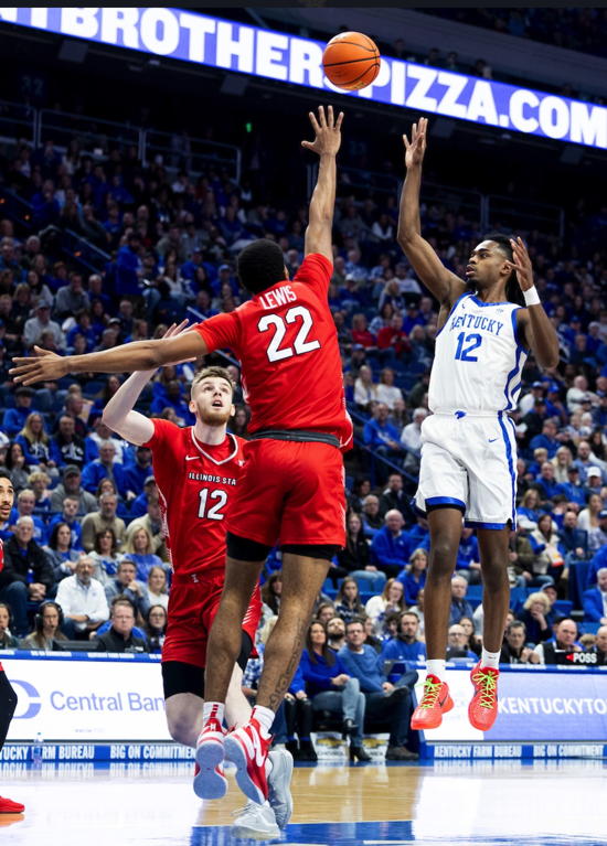 Antonio Reeves (#12) lofts a floater over former Illinois State teammate Kendall Lewis (#22)