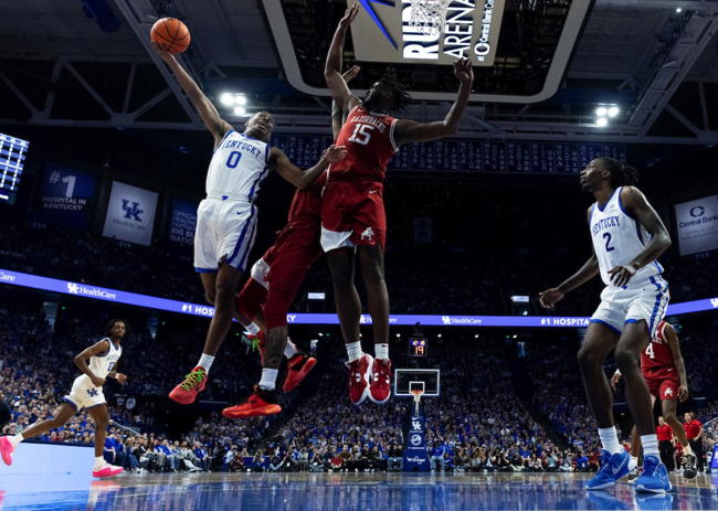 Rob Dillingham (#0) stretches to get a shot off while defended by Arkansas' Makhi Mitchell (#15)