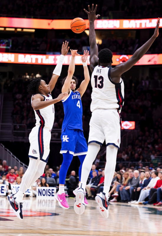 Koby Brea (#4) shoots while defended by Graham Ike (#13) and Michael Ajayi