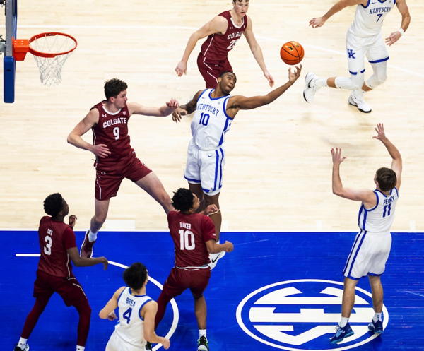 Trent Noah (#9) shoots over the outstretched arms of Colgate's Brady Cummins (#1)