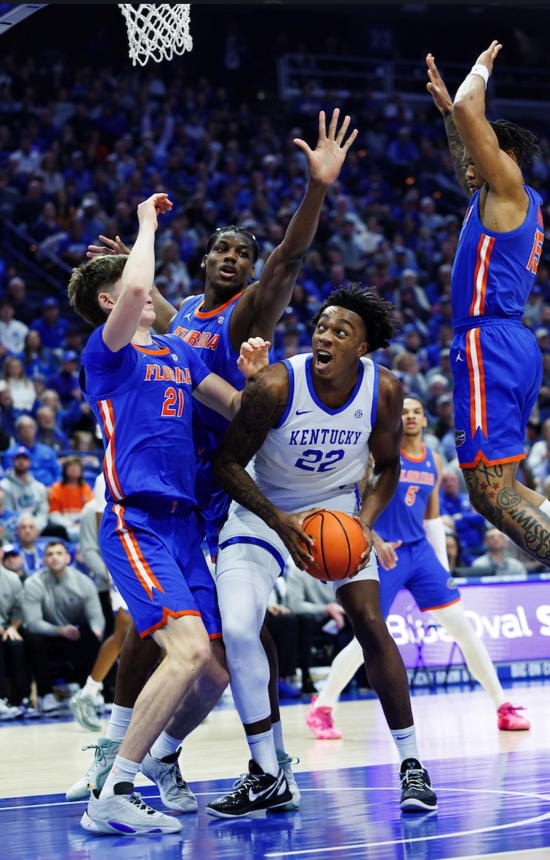 Amari Williams (#22) works inside against three Florida defenders: Alex Condon (#21); Rueben Chinyelu (#9) and Alijah Martin (#15)