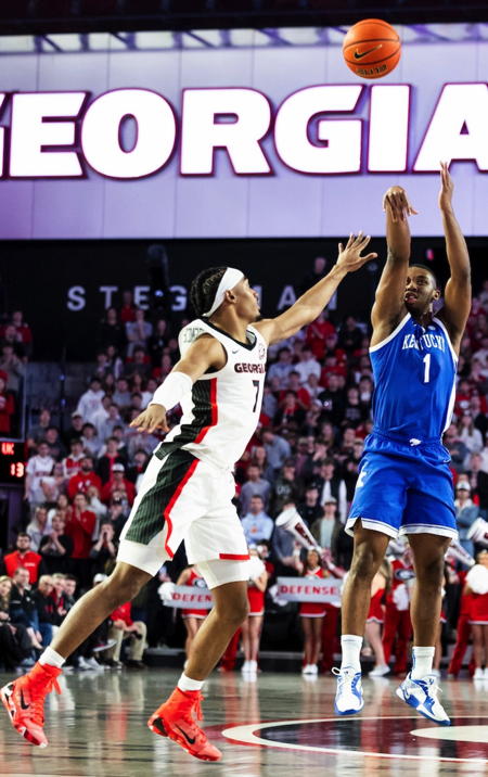 Koby Brea (#4) shoots over Georgia's Dakota Leffew (#1) and former UK signee Somto Cyril (#6)